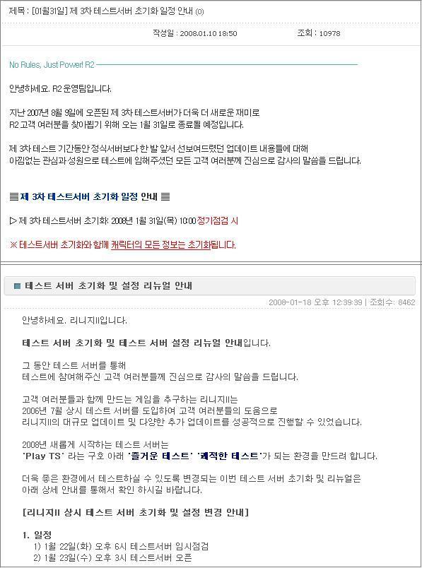 ■ R2 테스트서버 초기화 일정 : 2008년 1월31일(목) 10:00 정기점검