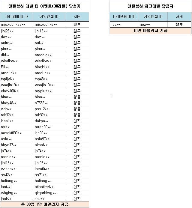 당첨 기준은 엔젤삼천 가입 후 30레벨에 먼저 도착하신 30명 대상이며 그 중 레벨이 가장 높은신 분에게는