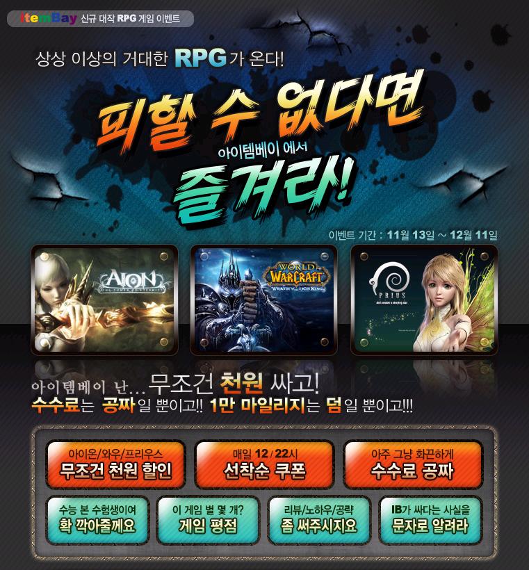 또한 수능 수험생을 대상으로 한 이벤트도 실시한다. 수능시험을 치른 수험생 모두에게 2천원 할인쿠폰을 지급하는 이벤트로 아이온, 와우, 프리우스는 물론 아이템베이에서 거래되는 모든 게임 물품에서 금액에 상관없이 사용할 수 있다.