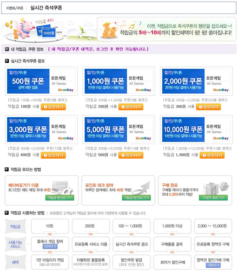 실시간 할인쿠폰 지급은 적립금을 사용해 할인쿠폰을 지급받을 수 있는 서비스로 500원부터 1만원까지 다양한 할인쿠폰에 응모할 수 있다. 적립금이 있는 회원이면 누구나 응모할 수 있으며 당첨율 또한 최대 60%로 당첨 가능성이 높다.