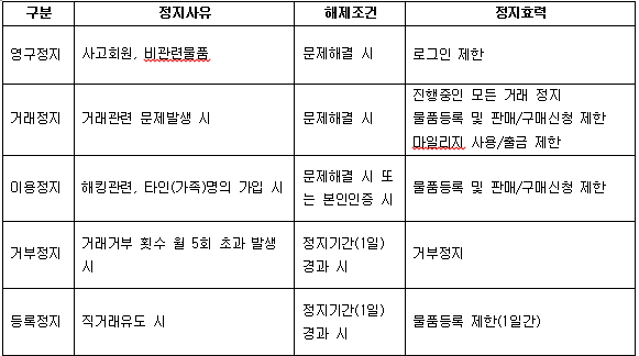 ①회사는 중개서비스를 통한 거래의 안전성과 신뢰성을 위하여 일정한 정지사유 발생 시 회원자격을 정지할 수 있습니다. 회원자격이 정지된 회원은 중개서비스의 일부 또는 전부를 이용할 수 없습니다.